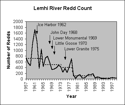 The jagged solid line shows the actual counts from one year to the next. The stepwise dashed line shows averages for blocks of years roughly defined by the effects of the dams. The average Lemhi River redd count from 1957 to 1964 (as indicated by the dashed line) was 714. After Ice Harbor was installed in 1962, the average dropped to 500. When the fourth dam, Lower Granite, was finished, the average Lemhi River redd count dropped to 110. The average dropped to 34 in the following decade, probably a long-term cumulative effect.