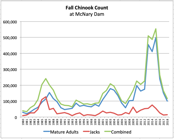 As fish runs decline, fishing opportunity also is greatly reduced. Harvest of coho has fallen from a high of nearly 3 million fish in 1976 to less than half a million fish in 2017, according to the Washington state Department of Fish and Wildlife. Chinook catches are also down, with nearly 1 million chinook caught in 1973 and only about half of that in 2017.