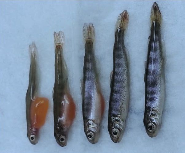 Fairly soon after entering the chambers, the eggs began hatching. Over a period of weeks and months, the alevin reached the fry stage and began emerging into a second chamber. Each day, the team recorded the size, length, weight, condition, and state of development of the emerging fish.